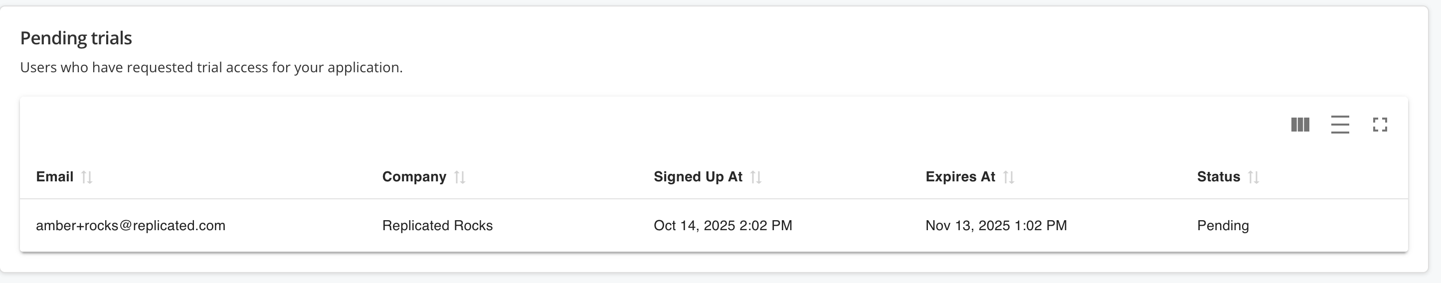 2. Under Pending Trials, review details about any pending self-service sign-ups, including the user's email address, company, sign-up date and time, and more.